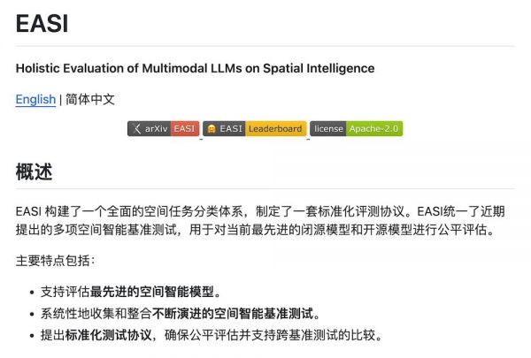 与此同时,商汤还同步开源了空间智能测评平台EASI及其“英雄榜”,为统一测评口径、展示模型进展和推动开源生态合作。