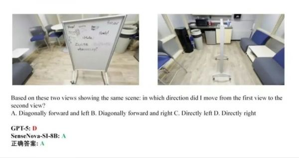 5、视角变换下的方向判断题(室内):在白板、椅子、沙发等室内场景中,判断物体位置变化所代表的观察者移动方向。GPT-5选择D,SenseNova-SI-8B选中正确答案A(向左前方移动)。