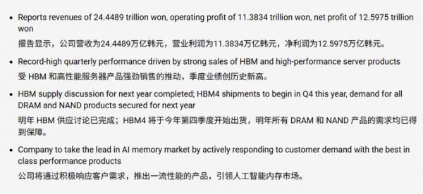 不过,更猛的还是海力士,作为HBM等内存的主要供应商,其第三季度营收高达 24.4489 万亿韩元(约合人民币1209.52亿元),同比增长39%,而营业利润则高达11.3834万亿韩元,同比增长62%,净利润12.6万亿韩元,同比增长高达119%,直接创下历史新高。