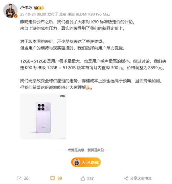 面对破防的红米粉丝们,卢伟冰最终也站出来回应了大家的疑问,直言上游厂商的成本压力已经直接影响到了终端,即使强如小米也无法在这种情况下依然维持定价稳定,不过考虑到用户们的需求,最终决定在K90的首销期间将12+512GB版本降价300元,也就是2899元。