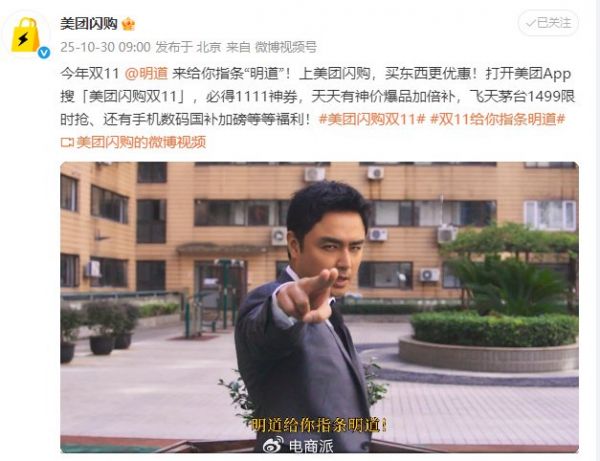 于是我们看到,美团闪购联动艺人@明道,借用“明道”姓名谐音梗,打造“给今年双11指条明道”的病毒传播概念。