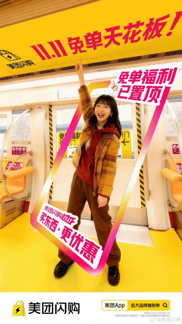在该项活动的营销层面,一方面,美团聚焦线下场景,在北京地铁进行包线投放,利用“东单”“西单”站名与“免单”谐音梗制造记忆点,强化大众印象。另一方面,美团闪购在线上引爆话题。#美团闪购百大品牌免单# 微博话题上线,结合地铁实拍图形成UGC传播,同时百大品牌官微矩阵式发布联合海报。