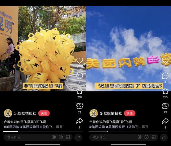 后续,美团闪购还计划推出“袋你飞”系列营销活动,打造美团闪购经典的“黄袋子”创意主角,联动全国各大景区设置快闪导游点,并与最近爆火的网红大V李飞进行联动,进一步传播“袋你飞”的谐音梗。同时,打造一系列线下事件,不仅放飞巨型文案,还有满载着气球的配送小哥出现在街头,进一步强化大众记忆。