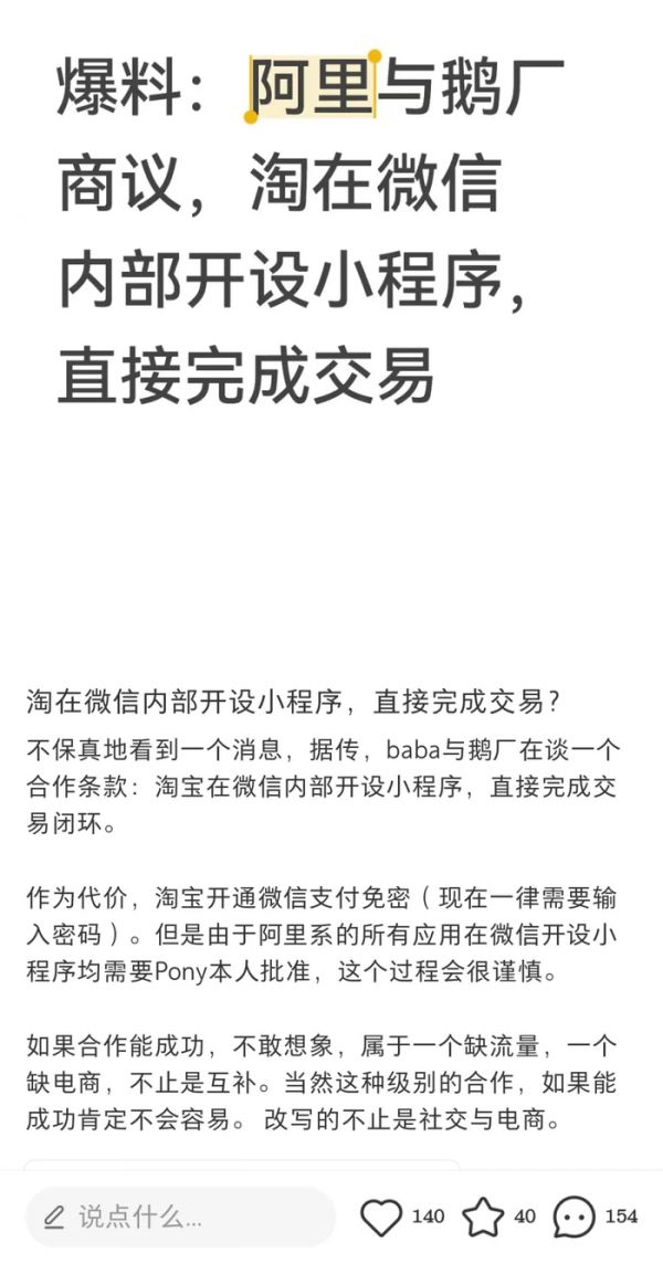 就在京东入口调整落地后不久,市场流传重磅消息:微信正与阿里巴巴就深度合作展开磋商,核心方向为淘宝在微信生态内上线官方小程序,实现商品浏览、下单、支付的全流程闭环交易;作为对等条件,淘宝或将向微信支付开放“免密支付”功能,以简化操作步骤提升转化效率。