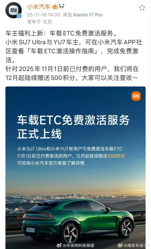 【#雷军宣布车载ETC免费激活#,已付费的用户补偿500积分】#雷军称为已付费ETC用户补偿积分#小米董事长兼CEO雷军今日在微博发文宣布,今年上市的小米SU7 Ultra与YU7均内置车载ETC功能且已开启免费激活。对于此前已付费激活的用户,将从12月起陆续获赠500积分。据了解,小米YU7标配的ETC采用隐藏式设计,用户可在车机内自由开关,配合智能辅助驾驶系统,能高效通过高速收费口,而此前车主激活该功能需花费50元。
