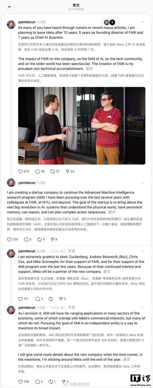 【#Meta首席AI科学家杨立昆离职##Meta首席AI科学家回应离职#】效力 12 年后,Meta 首席科学家杨立昆(Yann LeCun)今日宣布即将离职,并创办自己的 AI 创业公司。