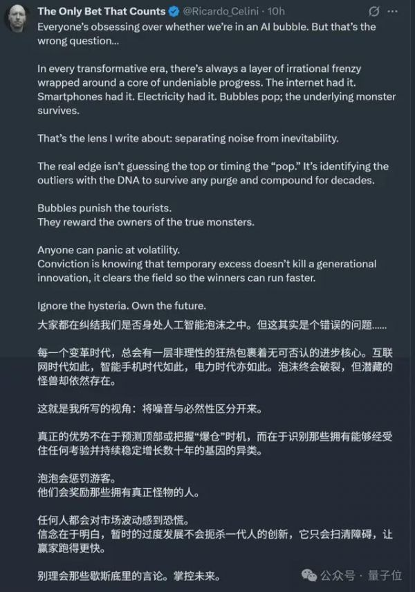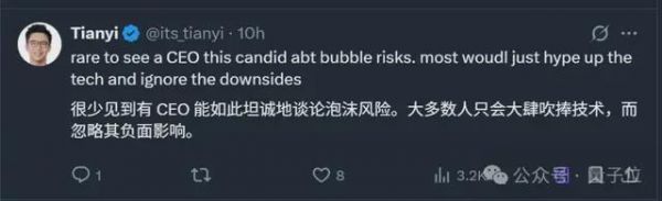 这无疑体现在他对“AI泡沫”的最新表态上,正当Gemini 3 Pro掀起全网热议之时,他却忧心直言: