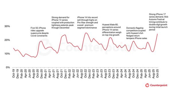 根据Counterpoint Research的调研数据,10月份国内智能手机市场,苹果iPhone实现了37%的销量增长,最终推动市场总销量实现了8%的增长。不过华为在10月份的表现相当一般,销量相较于去年同期下跌19%。