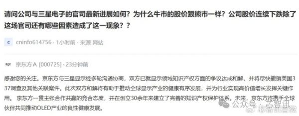 11月19日,京东方在投资者关系平台上也回应称,京东方与三星显示经多轮沟通协商,双方已就显示领域知识产权方面的争议达成和解,并将尽快撤销美国337调查及其他关联案件。此次双方和解将有助于推动全球显示产业的健康有序发展,并为行业实现高价值增长发挥关键作用。