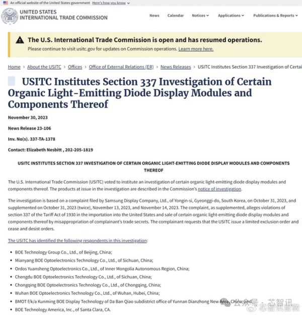 对此,京东方当时回应称,针对当前美国ITC行政法官对于商业秘密337调查的初裁结果,京东方将积极向ITC提出复审,同时也将积极维护公司的权益。京东方还强调,公司一贯主张合作共赢的竞合态度,积极维护全球半导体显示产业健康发展。此前在专利337调查的终裁结果中,ITC已认定京东方不存在违反337条款的情形。