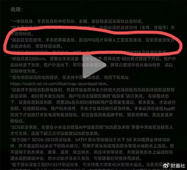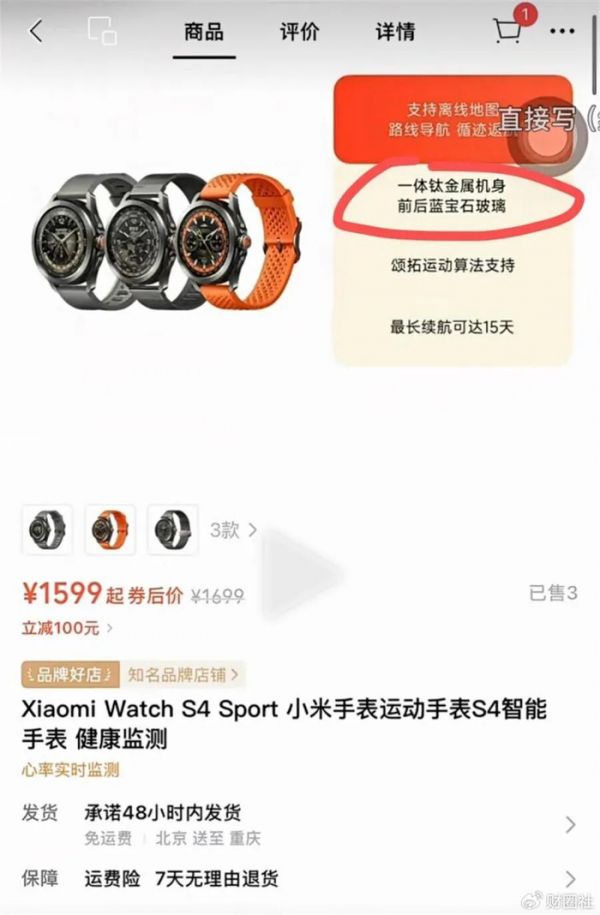 近日,一位博主在小米商城内选购运动手表时发现,商品图的文字介绍写着:“一体钛金属机身,前后蓝宝石玻璃。”
