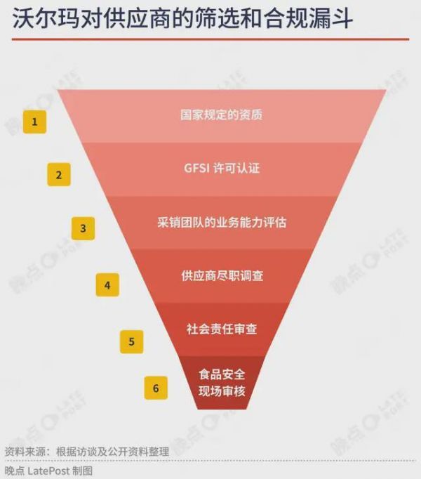 沃尔玛的供应商筛选体系极为严格。准入环节设有六道关卡,包括国家规定资质、GFSI 全球食品安全认证、沃尔玛业务筛选、供应商尽职调查、社会责任审查及食品安全现场审核,任何一关不合格即被淘汰。