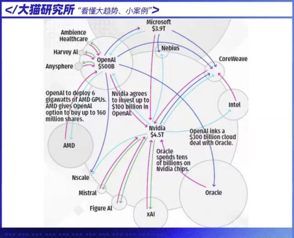 最典型的就是甲骨文,910一夜之间增加了1000亿美元的市值,因为说拿到了3000亿美元的大单,其实呢,是它给了OpenAI价值3000亿美元的云服务使用额度,OpenAI就用这个额度去购买甲骨文的云服务,甲骨文就有了3000亿的收入。这都是刷爆信用卡的打法。然后它再用这些“收入”去向英伟达买芯片,但是这么大交易里,都是空对空。所以两个月过去了,甲骨文的股价又跌回了9月初。