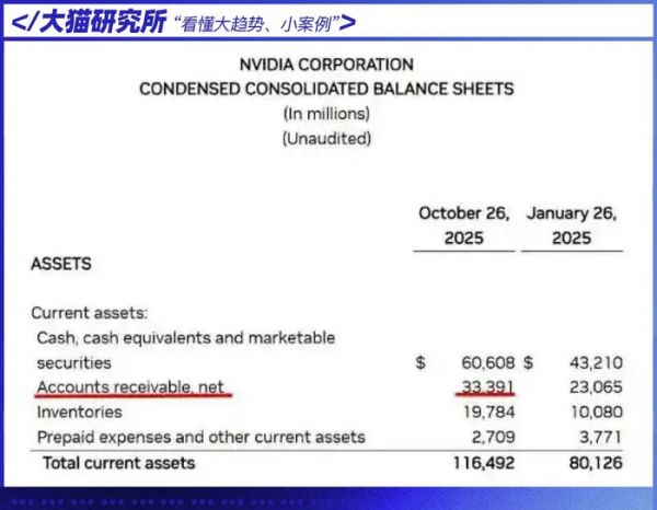 英伟达要把芯片卖给客户,比如OpenAI和微软,但是允许客户“打白条”,一分钱不用花,最新的财报显示Q3收入570亿,但应收款334亿,占比58%,这是非常危险的。