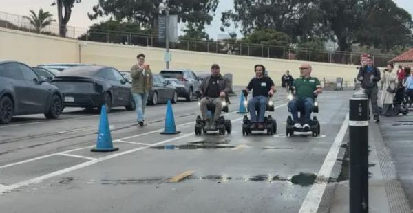 Scott、Micah 两位 YouTube 博主和 Usman 坐着 ev¹,看谁先到达车道末端。
