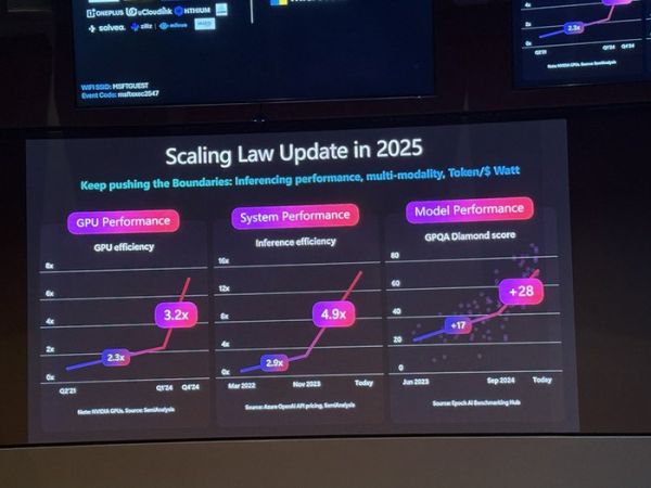 陶然:非常好的问题。首先分享一下我们从微软视角看到的全球 AI 趋势。三四年前大家可能听过一个buzzword,叫 Scaling Law(缩放定律)。Scaling Law本质上有点类似 PC 时代改变世界的摩尔定律:摩尔定律定义了我们从纸质时代迈向信息化时代,因为 CPU 的算力每 18 个月都会显著提升,使个人电脑不断变强,从而推动整个人类完成信息化。