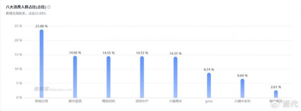 从消费身份来看,新锐白领、都市蓝领、精致妈妈、资深中产与小镇青年分布均衡,构成了一条从一线城市到下沉市场的消费阶梯。