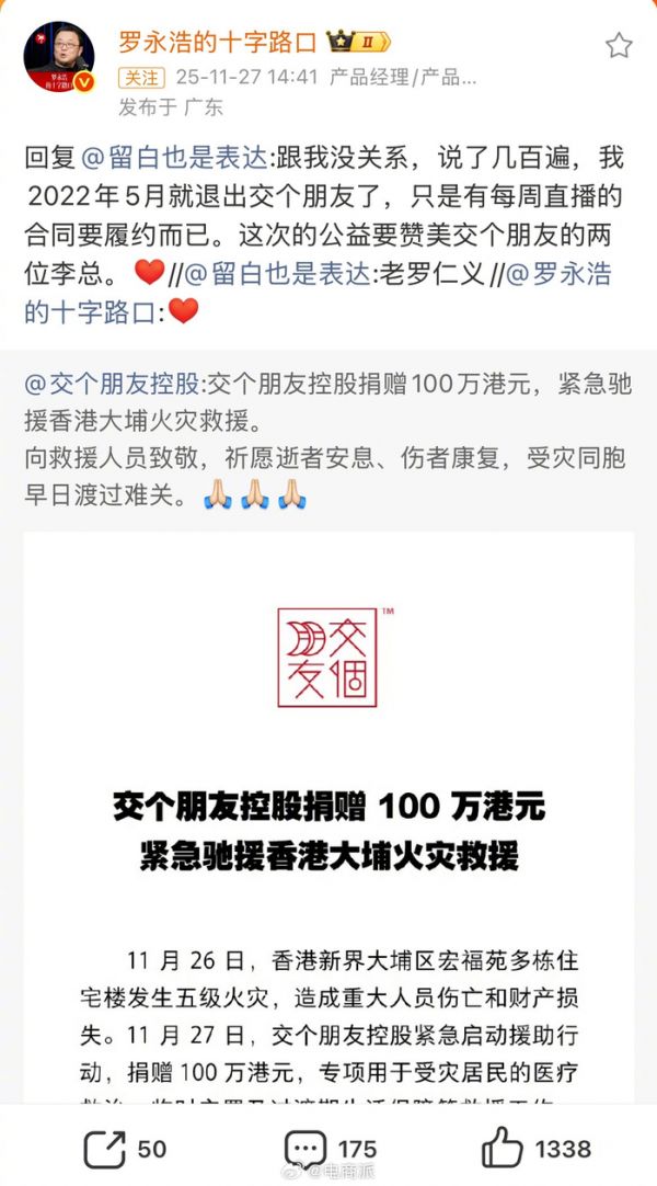 #罗永浩回应交个朋友捐赠100万# 网友赞“老罗仁义”!罗永浩澄清:已退出交个朋友,公益该夸交个朋友的两位李总。
