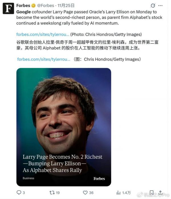 股价的持续飙升直接推动了两位创始人的财富排名大幅跃升,全球富豪榜大洗牌。拉里・佩奇以 2684 亿美元成为全球第二富豪,谢尔盖・布林以 2488 亿美元位列第三。这一变化意味着他们成功超越了亚马逊创始人贝索斯,仅次于特斯拉 CEO 马斯克。