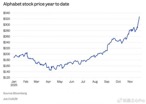 11 月 25 日美股开盘前,谷歌母公司 Alphabet(NASDAQ:GOOGL)股价飙升 2.4% 至 326 美元,刷新历史新高。事实上,这一涨势已延续数日,仅在前一交易日,该股就大涨 6.2%,过去五个交易日累计涨幅超 11.5%,近一个月涨幅更是高达 22%。