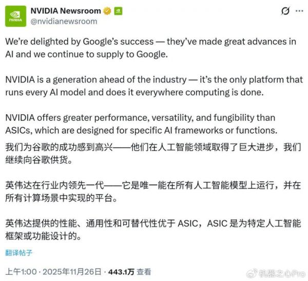周二,针对华尔街关于谷歌 AI 芯片可能撼动其 AI 基础设施统治地位的担忧,英伟达(Nvidia)回应称,其技术依然「领先全行业整整一代」,并强调其平台兼容所有 AI 模型。