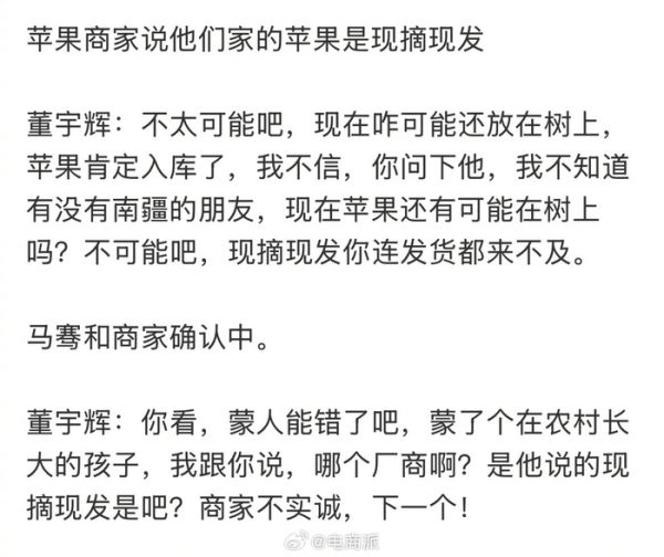董宇辉揭穿商家不实诚,现在哪有现摘现发的苹果,蒙人蒙错了吧。