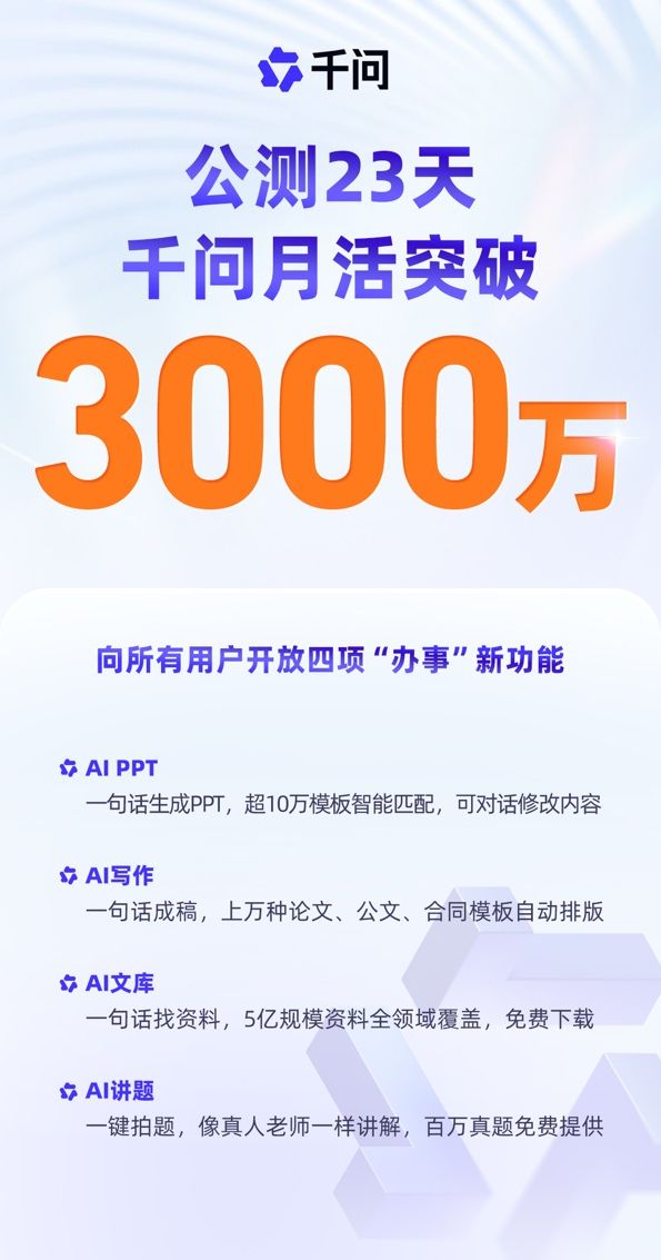 来源:猎云网12月10日,阿里巴巴官方信息显示,自11月17日公测仅23天,千问月活跃用户数(含APP、Web、PC端)已突破3000万,成为全球增长最快的AI应用。同时,千问APP正在加速从“会聊天”迈向“能办事”,向所有用户首批开放AI PPT、AI写作、AI文库、AI讲题四项新功能。