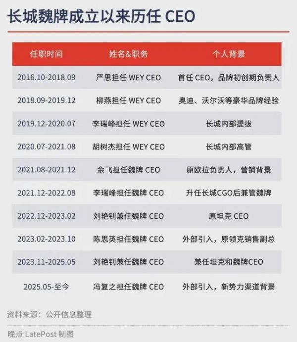 回看魏牌成立以来的 9 年,无论是品牌定位的多次调整,还是核心管理层的频繁变动——8 位历任 CEO,其中任期最短的仅四个月,“改变” 一直存在。而冯复之官宣上任至今不足一年。