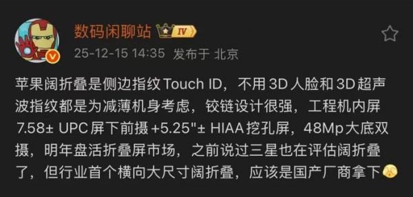 折叠屏iPhone Ultra:明年发布!小米MIX Fold 5:规格硬刚!