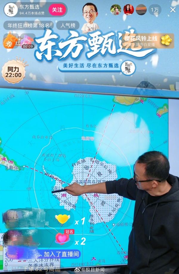 12月16号消息,昨晚新东方创始人、东方甄选CEO俞敏洪出现在东方甄选的抖音直播间,跟网友们聊南极旅游的经历并开启直播带货。