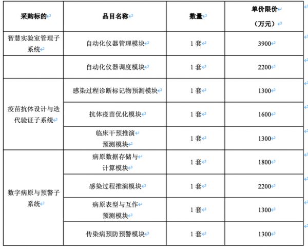 该项目于11月23日发布公开招标公告,预算金额为1.69亿元,采购标的包括智慧实验室管理子系统、疫苗抗体设计与迭代验证子系统、数字病原与预警子系统,涵盖了大数据平台、大模型开发平台、智能体应用开发平台、算力等领域的服务。
