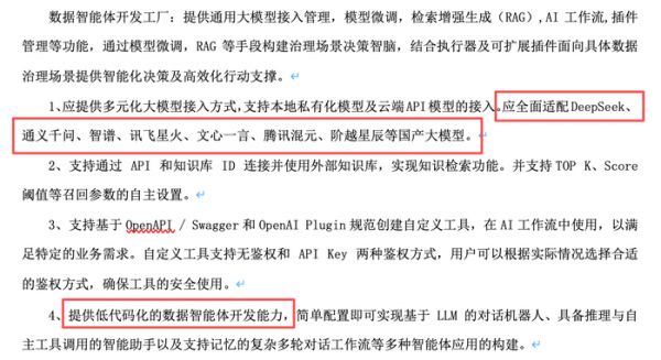 其中,平台资源数据治理软件的数据智能体开发工厂,要提供多元化大模型接入方式,支持本地私有化模型及云端API模型的接入,应全面适配DeepSeek、通义千问、智谱、讯飞星火、文心一言、腾讯混元、阶跃星辰等国产大模型。