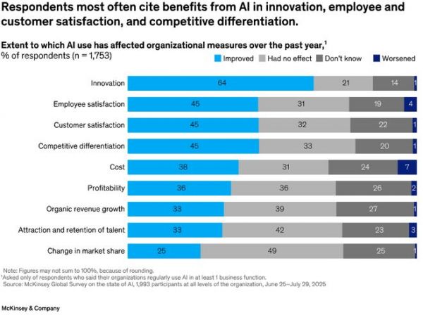 根据麦肯锡最新发布的“2025 AI报告”(《The state of AI in 2025》),在其访问的全球近2000家不同行业的企业与组织中,有88%已经开始使用AI技术,但只有36%表示改善了盈利能力,33%表示带来了即带来实质性的收入增长[2]。