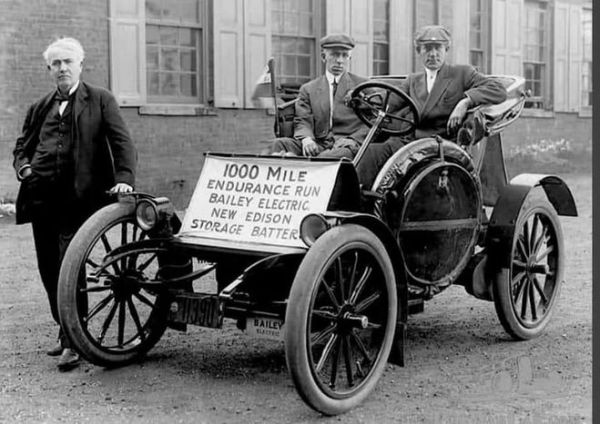 爱迪生(左)与1910年款的“Bailey Electric”电动汽车合影