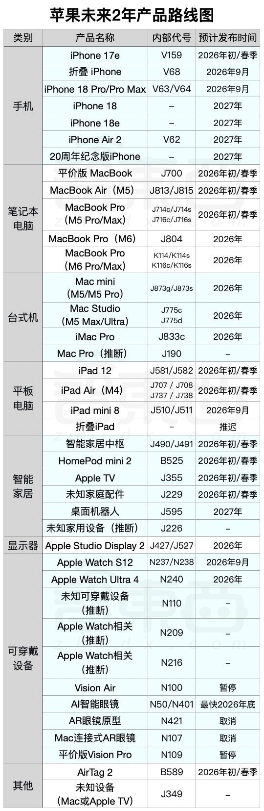 2026年上半年,苹果将发布入门机型iPhone 17e、跟踪设备AirTag 2、iPad 12和iPad Air以及部分智能家居设备,在笔记本电脑上,苹果将更新至M5芯片版本的MacBook系列,还将推出平价版MacBook。
