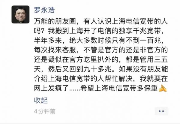 近日罗永浩在朋友圈吐槽,说搬到上海后办的独享千兆宽带,大半年实际网速常不到百兆,反复报修也只管三五天。