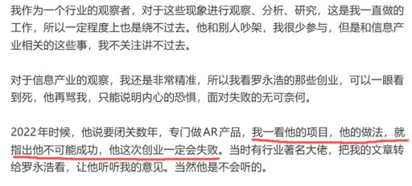 还强调自己2022年就预判罗永浩AR创业会失败,当时有行业大佬把文章转给他,可惜没被采纳。如今AR项目无下文,正好印证自己的判断,并且罗永浩绝对反驳不了。