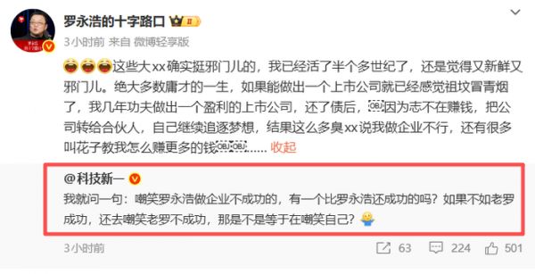 后面老罗转发评论也算变相回应:我几年就做出一个盈利的上市公司,只是现在志不在赚钱,现在居然有这么多人说我做企业不行,还要来教我赚钱。
