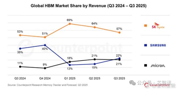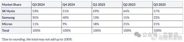 如果只看2025年三季度的HBM市场,SK海力士依然稳居第一,但其市场份额较上一季度下降了7个百分点至57%。相比之下,三星借 HBM3E 的强劲表现,其在第三季度的市场份额增长了7个百分点至22%。美光市场份额与上季持平,份额依然为21%。