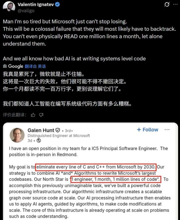 这个核心高级专家职位不是闹着玩的,他表示:「我的目标是在 2030 年消灭微软所有的 C 和 C++ 代码。策略是使用 AI 与算法的方式,重写微软整个代码库。」