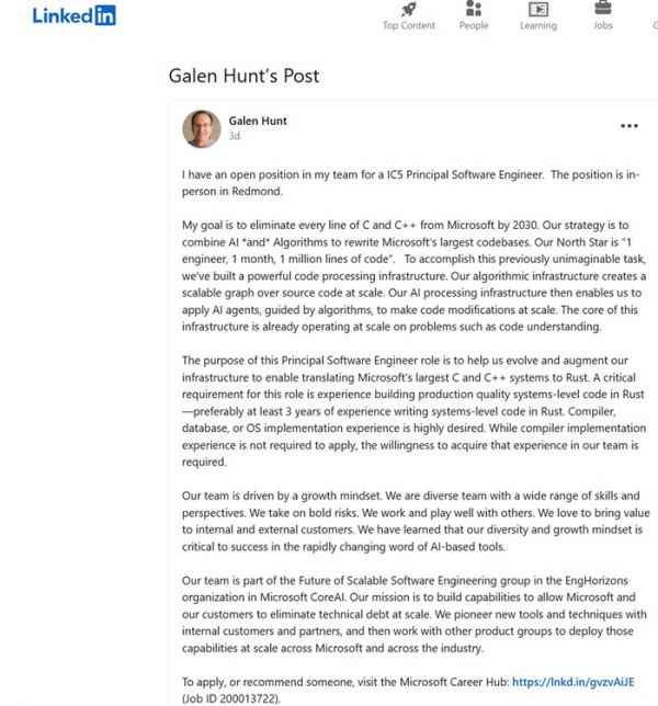 事情是这样的:发出此等言论的 Galen Hunt 是微软的一名杰出工程师,他在微软已经工作了 28 年。最近他在领英上招人,开放一个 IC5 首席软件工程师的职位。