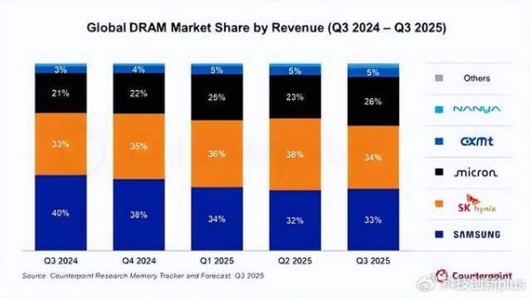 但虽然只有8年多时间,如今长鑫存储在全球市场,已经排在第4名了,仅次于SK海力士、三星、美光这三家巨头了,2025年Q3时,其份额为5%左右。
