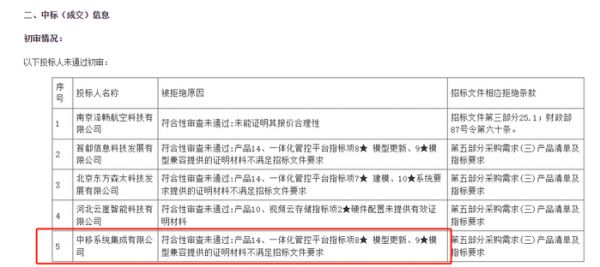 值得一提的是,项目同时公示了初审情况,五家投标人未通过初审。其中,中国移动专业子公司:中移系统集成有限公司被拒绝投标,原因是符合性审查未通过。具体来看,其投标产品14一体化管控平台的指标项“模型更新及模型兼容”,提供的证明材料不满足招标文件要求。