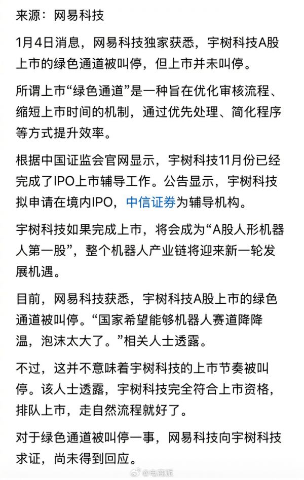 宇树科技上市绿色通道叫停