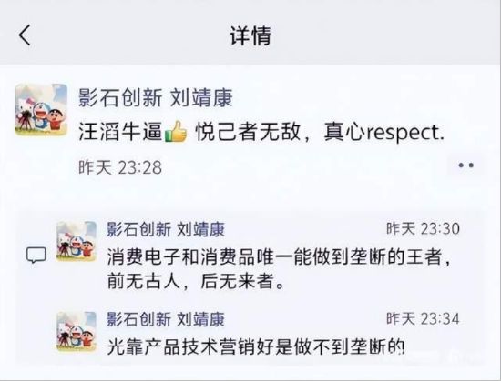 2025年10月底,刘靖康还在朋友圈提及大疆创始人汪滔:“悦己者无敌,真心respect。消费电子和消费品唯一能做到垄断的王者,前无古人,后无来者。”