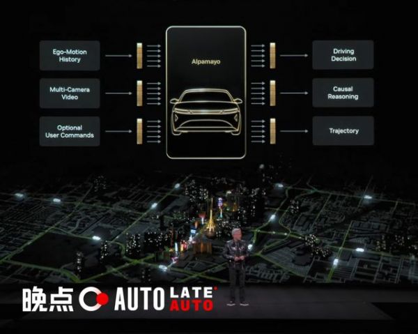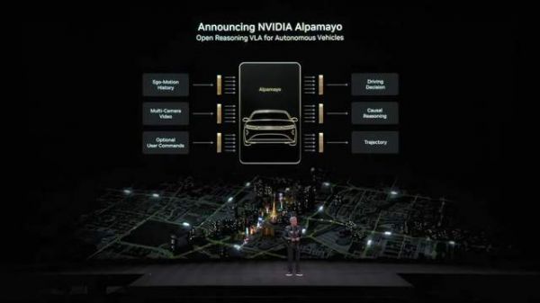 为了支撑这一野心,黄仁勋发布了英伟达自动驾驶开源 VLA(Vision-Language-Action, 视觉-语言-行动)模型 Alpamayo,宣称其是世界上第一个能思考、推理、自动驾驶车辆的开源 AI 系统。它可以视作英伟达在智驾技术路线全面转向 “端到端” 后推出的开源云端基座模型。