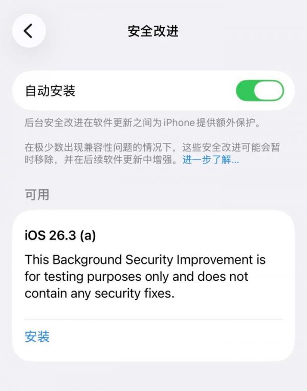 需要进入 iPhone 设置--隐私与安全性--后台安全改进,才能看到 iOS 26.3(a)的更新,然后直接安装即可。
