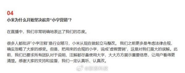 小米官方写道:“很多人都批评‘小字注释’是行业陋习,小米从现在做起立马整改。 我们之前更多是考虑法律合规,确实忽略了大家的感受。但是,把用来的合规的小字,说成‘虚假营销’,这是对我们莫大的误解。此前,我们已要求所有团队对于说明、注解都尽量使用大字,大大方方展示重要信息,让用户看得更清楚。感谢大家的支持和监督,我们一定认真听、认真改。”