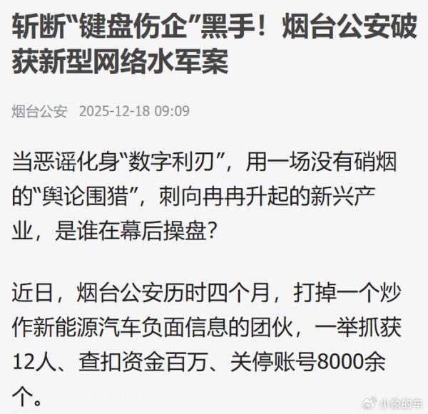 他们重点攻击小米汽车等企业,专门靠炒作新能源汽车负面牟利。警方抓获12名犯罪嫌疑人,查扣涉案资金100余万元,关停违法网络账号8000余个。