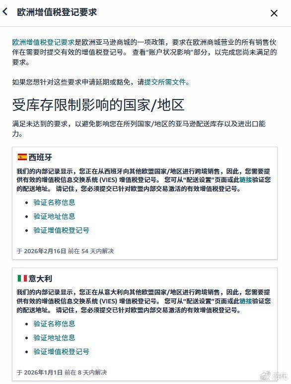 从2025年开始10月开始,亚马逊就要求卖家在收到邮件的60天内完成增值税注册。亚马逊泛欧计划警告,如果卖家60天内没有重新注册,那么卖家将失去欧盟税号(意大利的欧盟税号和本地税号一致),泛欧计划就不再满足要求。
